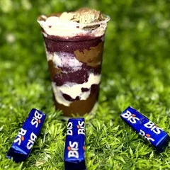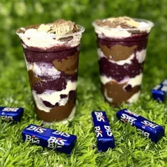 Acompanha 2 Açaís com Leite em pó e leite Condensado, Creme de Avelã montado em 4 camadas no Copo, mais Bis em pedaços nas 2 ultimas camadas. ( Adicionais Juntos ) Um dos mais Vendidos!