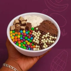 Açai Cremoso no Pote de Isopor de 300ml Acompanhado de Confetes, Chocopower, Gotas de Chocolate e uma Tortuguita de Chocolate com Recheio de Baunilha. (Todos os adicionais vão por cima como na imagem).