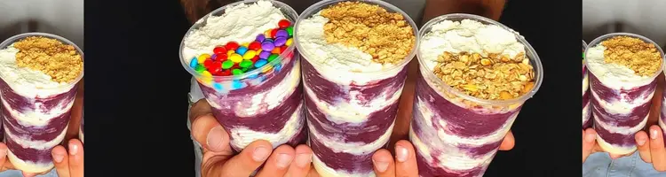 Delicioso Creme de Açai acompanhado de um Delicioso Creme Ninho e Paçoca em 4 Camadas de Recheio.